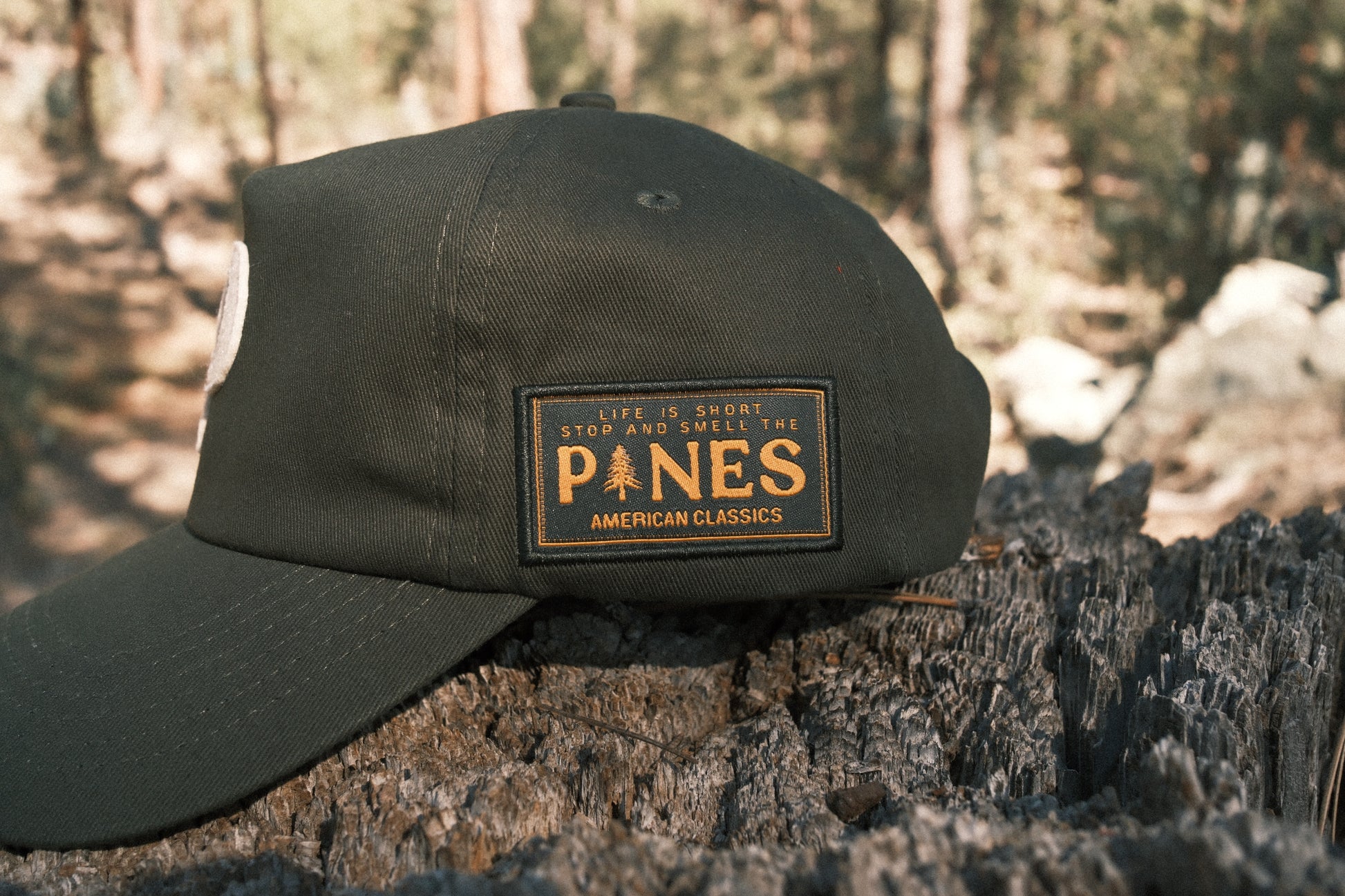 Pines woven patch on side + pine tree tab at back